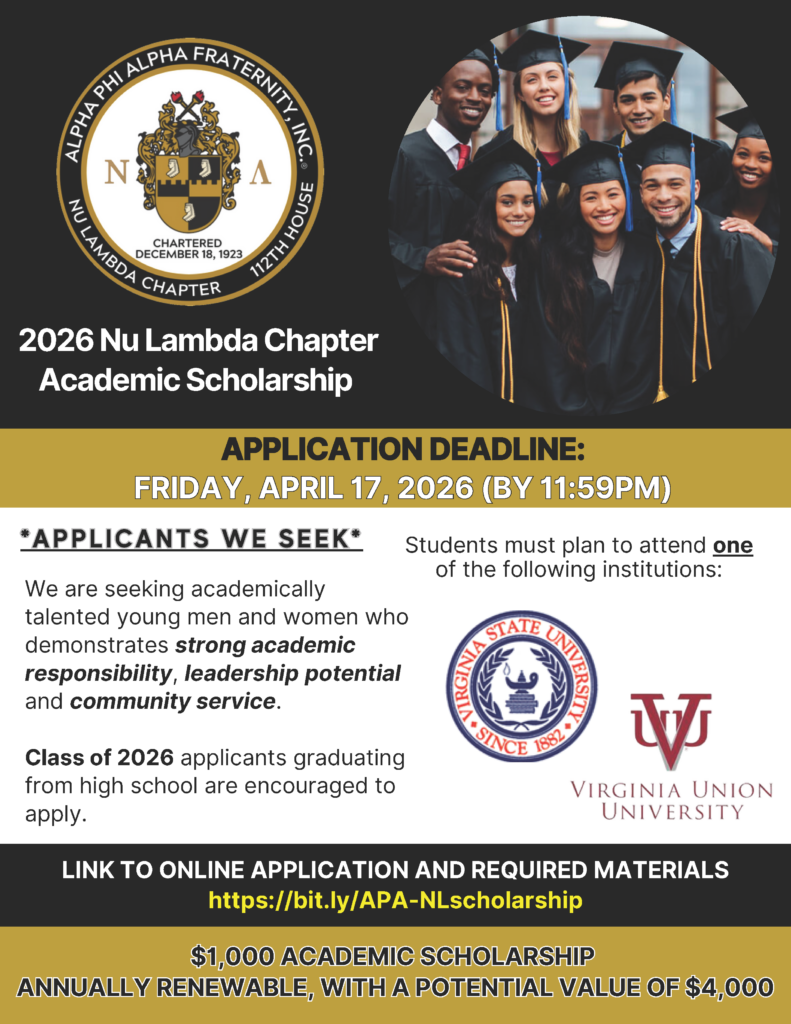 The Nu Lambda Chapter was established on December 18, 1923 at Virginia State College in Petersburg, Virginia. The charter members were: Brothers W.A. Hall, J. A. Derbigny, J. M. Gandy, C. W. Florence, W.A. Rogers, J. H. Johnston, F. D. Patterson, B. N. Thurston, and T. L. Puryear. Nu Lambda, throughout its history, has contributed to projects which have aided “scholarship and love for all mankind.”